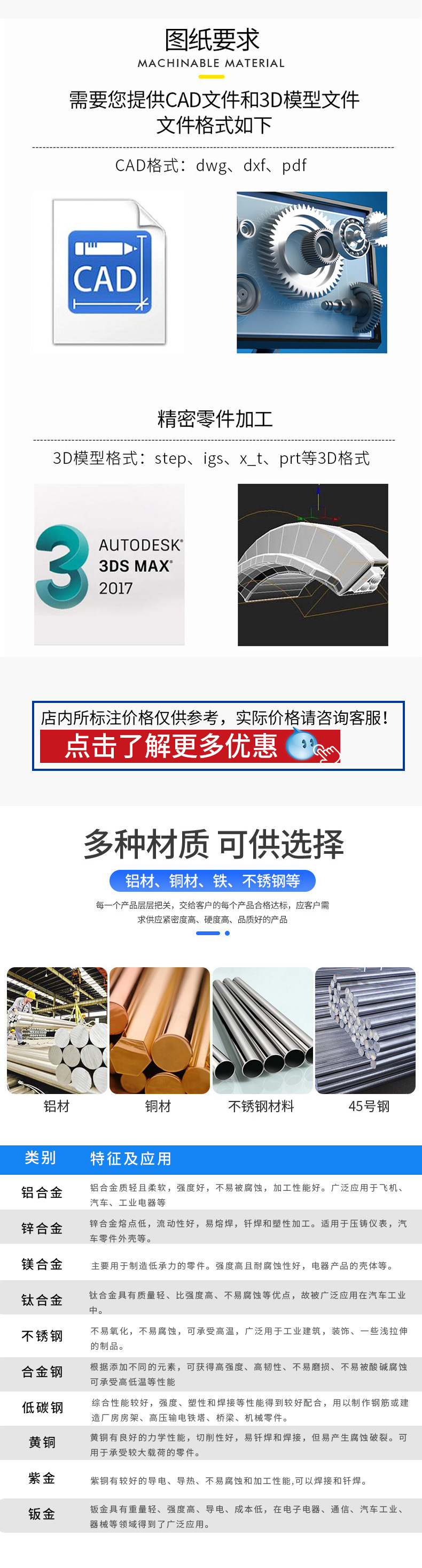 可加工材料:碳钢,铁,铝材,不锈钢板,特种钢材,钨合金,黄铜,耐热钢,铁板,不锈钢,高温合金,红铜,青铜,40CrMo/304,铝合金等,铝型材,齿轮钢,钛合金,铜,铝,不锈钢等,铝合金