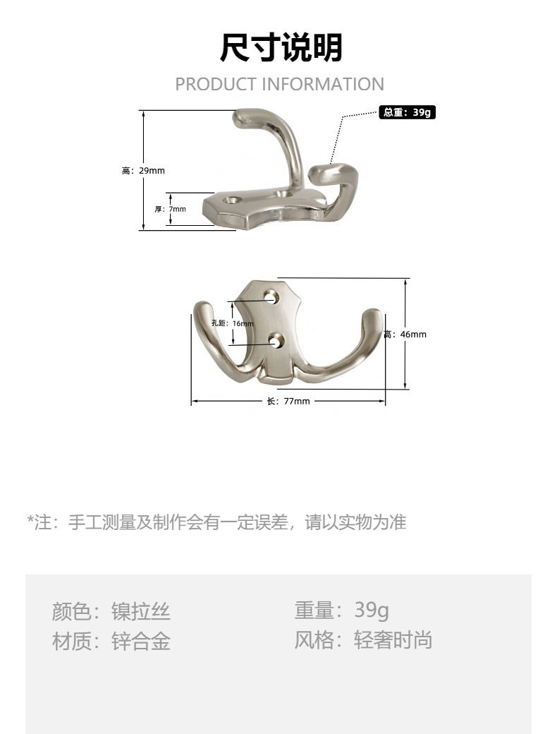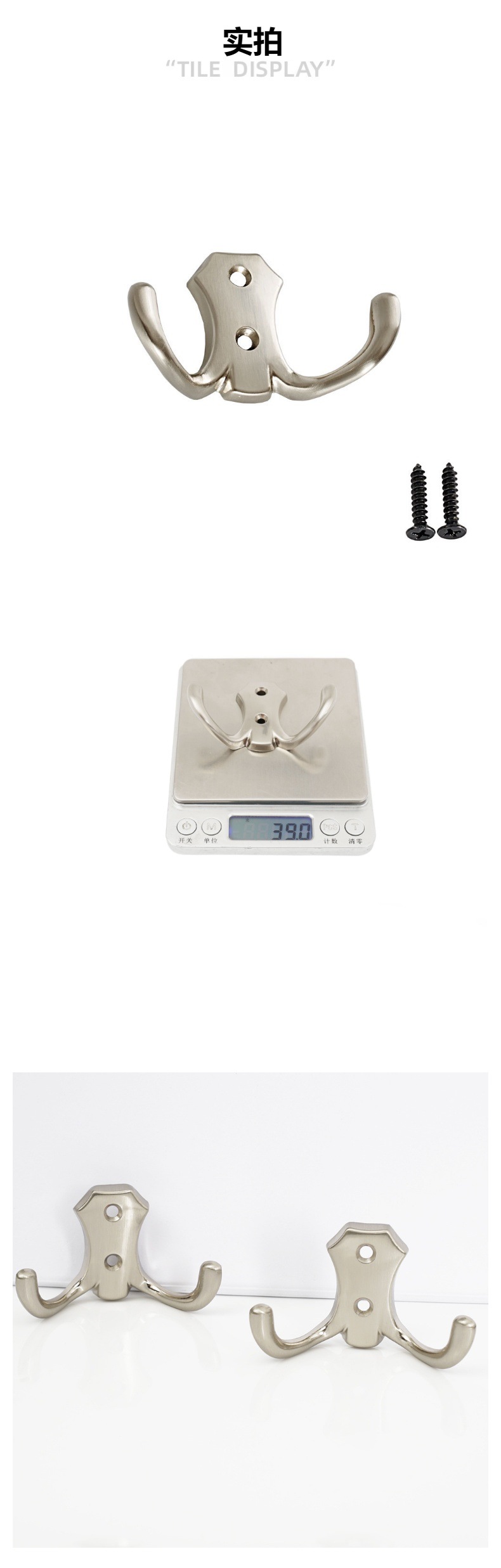 商品名称:锌合金双衣钩现代简约风格 家用门后挂衣钩 浴室厨房多功能挂钩