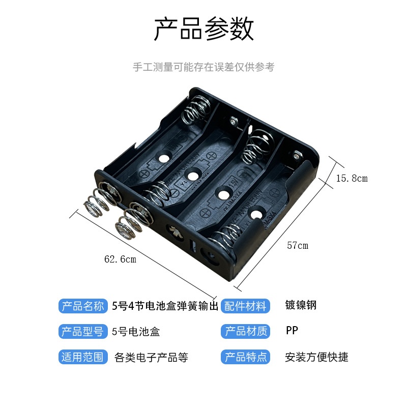 商品名称:4四节AA5五号无盖无开关6V电池盒装弹簧万能输出6V五5号AA电池盒