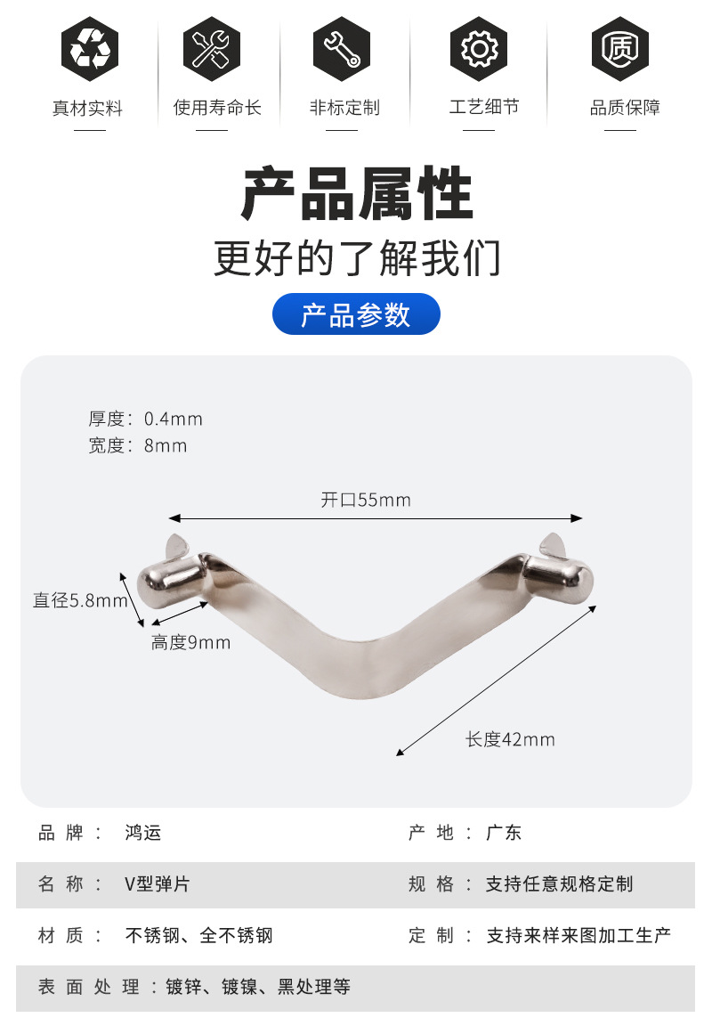 商品名称:v型U型弹簧片高弹性回弹性好自拍杆管内五金配件5.8×9×42mm