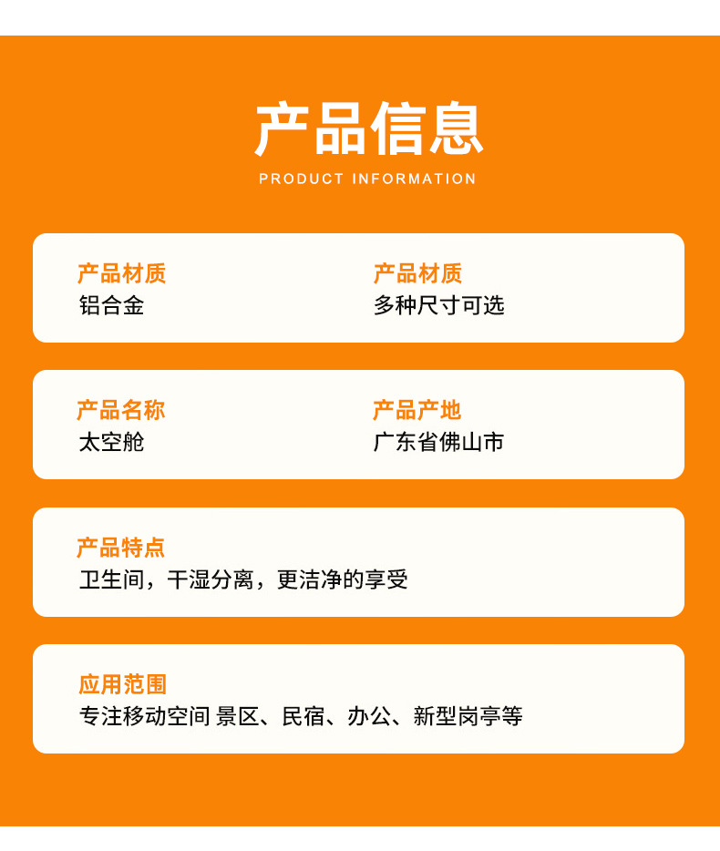 商品名称:广东厂家太空舱定 制移动民宿铝型材加工苹果仓酒店太空舱露营房