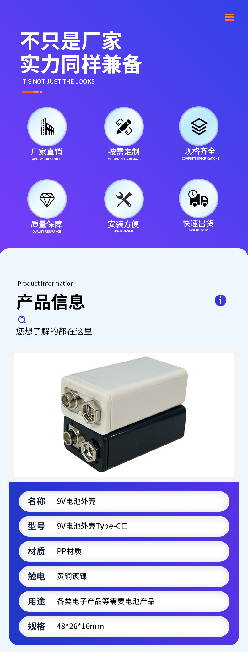 商品名称:Type-C充电口电池盒9V电池壳锂电池壳6F22锂电池盒9V方块锂电池盒